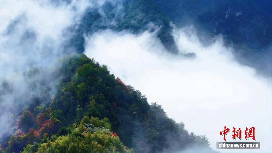 10月9日,陜西西安。雨過天晴,在秦嶺翠華山上,紅葉與云海美景同框呈現(xiàn)。群山之間,紅葉如霞似錦;翠華峰上,云海奔涌似浪,構(gòu)成一幅動(dòng)人心魄的秋日畫卷。圖為秦嶺翠華山云海景觀。
